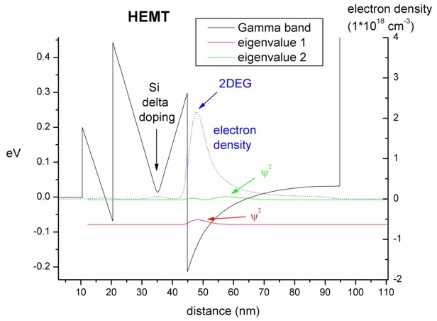 to a two-dimensional electron gas (2DEG). The electron density is plotted in blue.