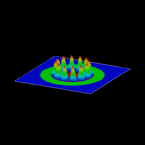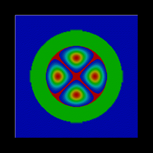 The following figures shows the square of the electron wave functions (i.e. psi²) of the corresponding eigenstates. They were calculated within the effective-mass approximation (single-band) on a rectangular finite-differences grid.