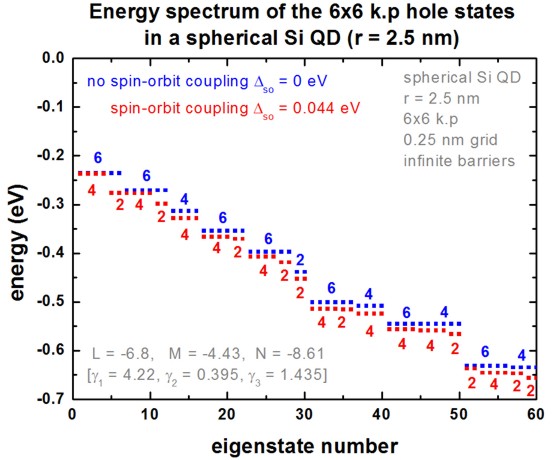 The following figure shows the hole eigenenergy spectrum of the Si QD (diameter = 5 nm) calculated with a 6-band k.p Hamiltonian.